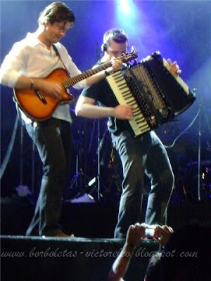 Para este show, mandei fazer uma camiseta com a foto que tirei ao lado do Vi no show que eles fizeram no Gigantinho em agosto... E como eu estava bem na frente, comecei a pular como uma louca e mostrar a camiseta pro Vi... Quando ele a viu, sabem o que ele fez? Abriu aquele sorriso lindo que só ele tem acompanhado de uma piscadinha!!! Meu Deus!!!! Fui e voltei das nuvens vááááárias vezes...